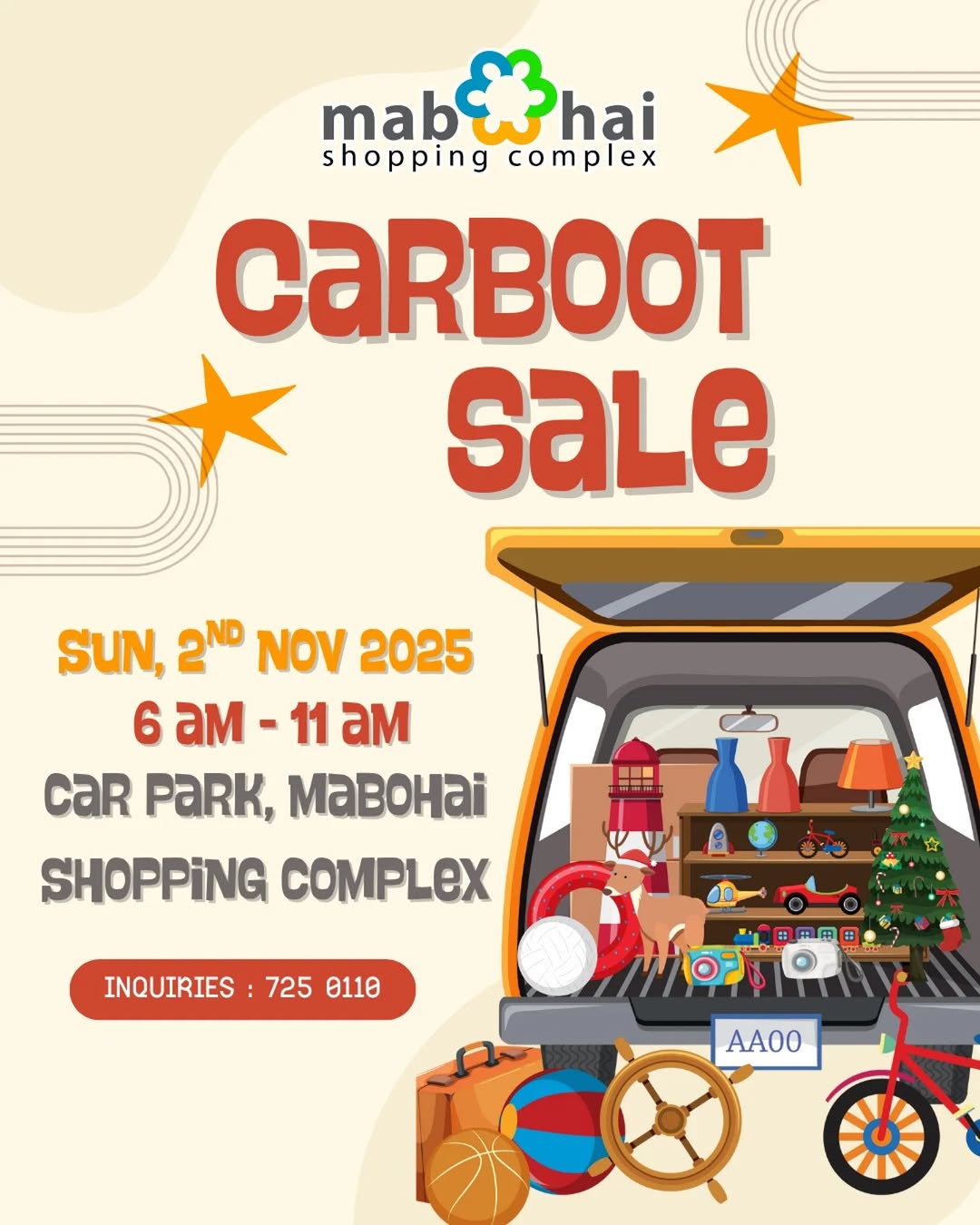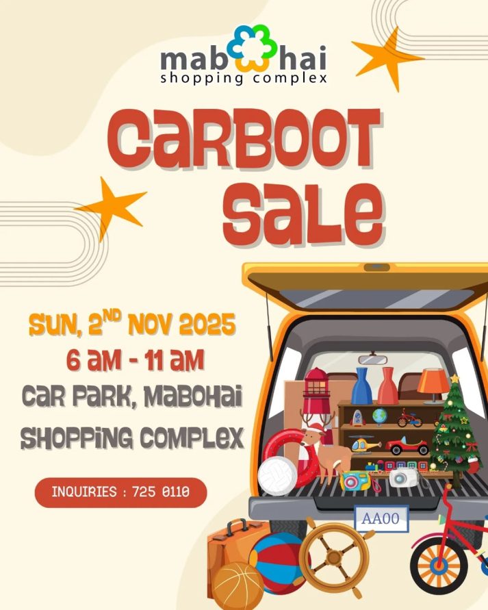 Car Boot Sale Posted in Events and tagged Car Boot Sale on 31/10/2025. Join us this November and explore a variety of preloved items and hidden gems at Car Park, Mabohai Shopping Complex. Sunday, 2 November 2025 6 AM – 11 AM Car Park, Mabohai Shopping Complex Contact 725 0110 for details