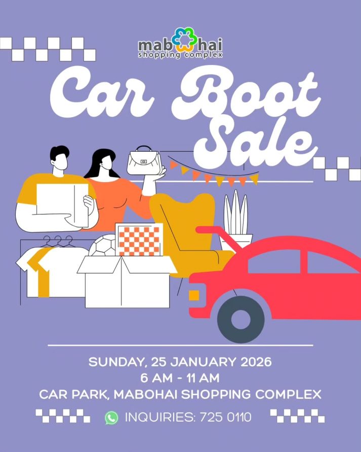 Calling All Vendors! Join our Car Boot Sale this Sunday at Mabohai Shopping Complex and be part of a lively morning filled with bargain hunters and good vibes. Perfect for selling clothes, accessories, household items and more!