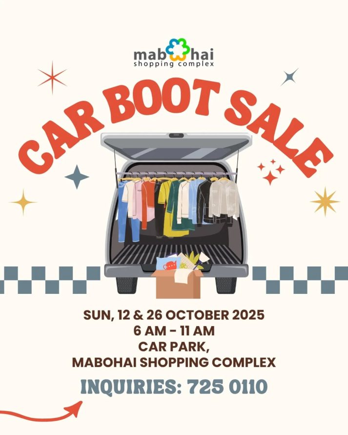 Car Boot Sale Posted in Events and tagged Car Boot Sale on 06/10/2025. Discover preloved finds and hidden treasures at Mabohai this October! Join us for two special Sundays of shopping. Sunday, 12 & 26 October 2025 6 AM – 11 AM Car Park, Mabohai Shopping Complex Contact us at 725 0110 for more information.