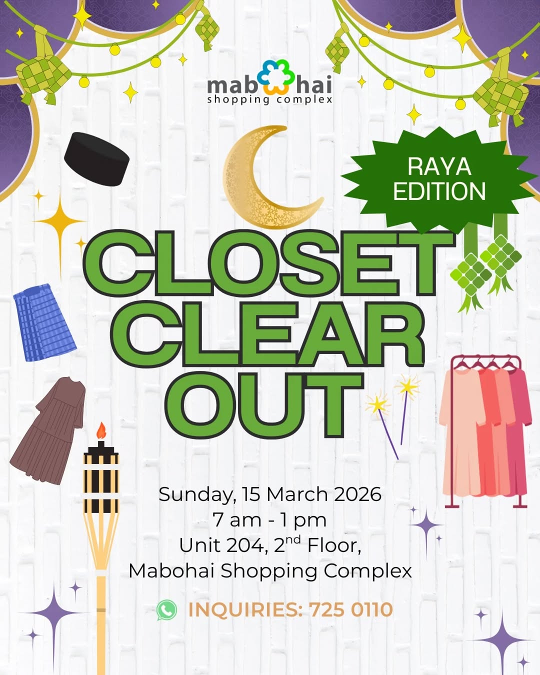 Ready for Raya? Join our Closet Clear Out (Raya Edition) at Mabohai Shopping Complex! Refresh your festive wardrobe by passing on pieces you no longer wear and earning extra cash for Raya. At the same time, uncover beautiful, quality outfits at amazing prices – so you can be Raya-ready without stretching your budget.
