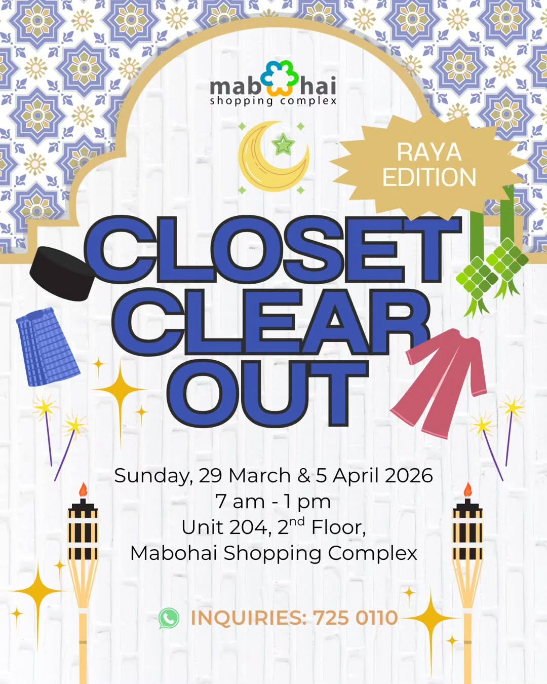 Celebrate the Raya season with our special Closet Clear Out at Mabohai Shopping Complex! Discover pre-loved treasures, festive outfits, and great Raya deals while enjoying the Hari Raya atmosphere. A perfect spot to browse, shop, and give preloved pieces a new home.